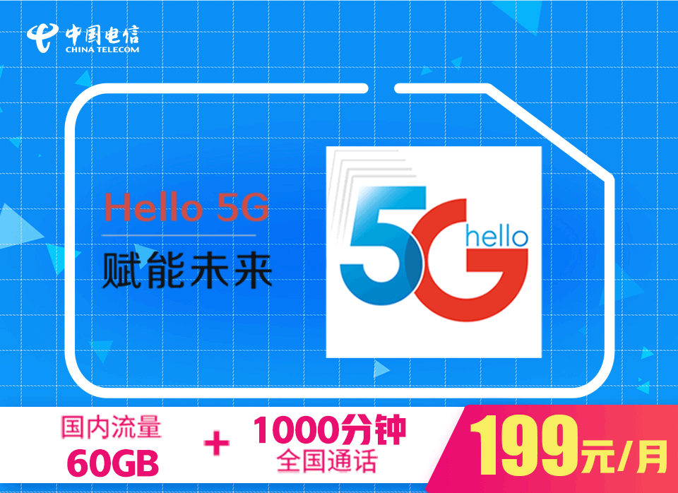 天翼5G畅享流量套餐:199元/月(60G+1000分钟)