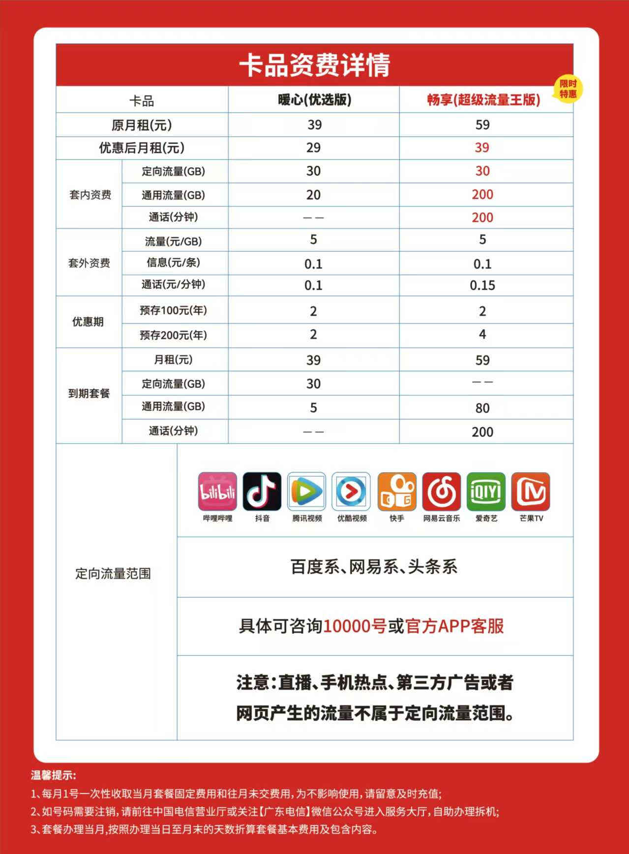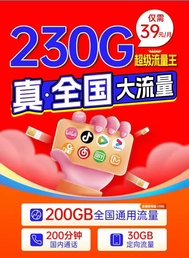 二、套餐详情:230G流量王卡39元月租,国内免费接听、送来电显示;每月包:200G通用流量+30G定向流量+200分钟全国通话(优惠期四年),超出套餐外流量按5元/G,国内通话按0.1元/分钟计费,国内短/彩信:0.1元/条,开通需预存200元话费一次性到帐使用。